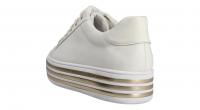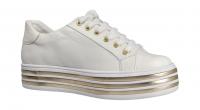 Der weiße Schnürer von Gerry Weber hat ein dicke Plateausohle, die mit goldenen Streifen verziert ist. Das Oberleder ist besonders weich, die Decksohle kann gegen eigene Einlagen ausgetauscht werden. Die Komfortweite macht ihn zu einem bequemen Alltagsbegleiter.