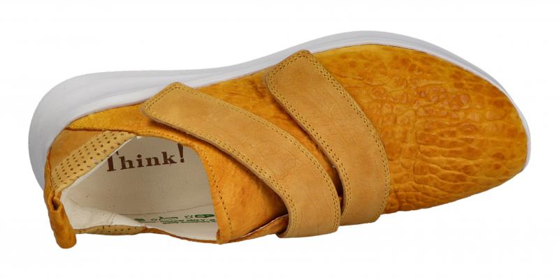 Der tolle Sneaker von Think hat ein sportliches Design, mit neuer Sohle. Hingucker sind die beiden Klettriemen, die schräg verlaufen. Toll ist auch das genarbte Leder, das für einen besonderen, einzigartigen Look sorgt. Die schöne gelbe Farbe bringt gute Laune in den Frühling. Wie immer bei Think verfügt der Sneaker über eine herausnehmbare, bequeme Innensohle.