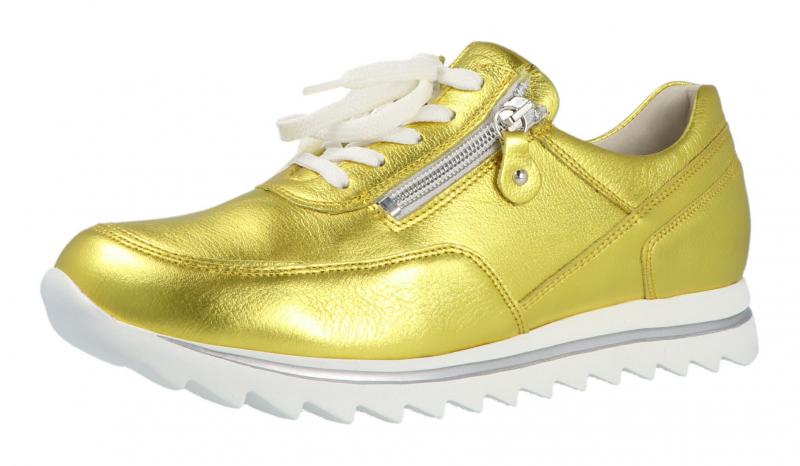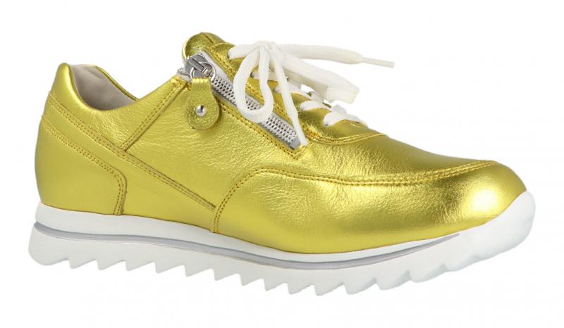 Modischer und zugleich bequemer Sneaker von Waldläufer in knalligem gelben Metallic-Leder. Die moderne Keilsohle ist sehr leicht, flexibel und profiliert. Der Halbschuh ist in Bequem-Weite H geschnitten, für mehr Komfort. Das Fußbett ist herausnehmbar und somit für Einlagen geeignet. Die Ferse ist schmal gearbeitet. Mit der Schnürung kann die Weite perfekt angepasst werden. Ein Reißverschluss erleichert das Anziehen.