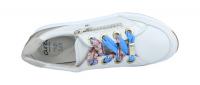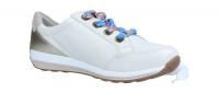 Bei diesem sportlichen Sneaker von Ara besteht das Obermaterial aus weichem Glattleder. Das Frottee-Innenfutter auf Bambusbasis, ist sehr hautfreundlich, angenehm atmungsaktiv und sorgt für ein natürliches Fußklima. Der Sneaker hat ein weiches, anpassungsfähiges Wechselfußbett, welches dank gepolsterter Zonen für hohen Tragekomfort sorgt. Gleichzeitig ist die Innensohle herausnehmbar und ermöglicht das Tragen von eigenen (orthodädischen) Einlagen. Die bequeme H-Weite lässt dem Fuß, insbesondere den Zehen, mehr Platz. Mit der Schnürung kann der Schuh perfekt dem Fuß angepasst werden. Der zusätzliche Reißverschluss sorgt für einen bequemen Einstieg und erspart lästiges Schnüren. Der kleine Keilabsatz sorgt für ein angenehmes Tragegefühl. Hingucker sind die bunt gemusterten Schnürbänder, die bei Bedarf durch die mitgelieferten weißen Schnürsenkel ersetzt werden können.