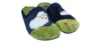 Süße Hauspantoffel von Manitu Home. Der linke Schuh zeigt ein anderes Motiv als der rechte. Obermaterial, Futter und Decksohle sind aus einem kuschligem Flauschstoff.