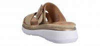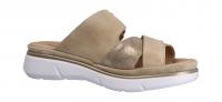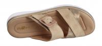 Die schöne Pantolette von Rohde überzeugt mit weichem Nubukleder kombiniert mit goldenen, leicht glänzenden Riemen. Die Sohle ist ebenfalls mit beigem Nubukleder und einer goldenen Umrandung eingefasst. Die Keilplateausohle dämpft die Schritte. Die extra weich gepolsterte Decksohle gibt Ihnen das Gefühl auf Wolken zu laufen. Mit der Schnalle lässt sich die Weite am oberen Riemen etwas regulieren. Das Lederfutter ist ideal zum barfuß Tragen geeignet.