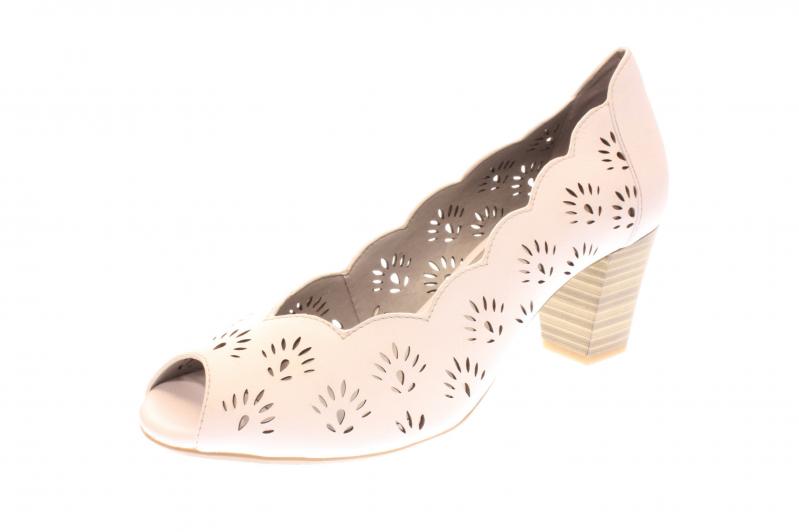 Der sommerlicher Peeptoe von Gerry Weber ist aus weichem Glattleder. Der modische Blockabsatz hat eine angenehme Höhe und die weich gepolsterte Decksohle sorgt für Tragekomfort. Durch den leicht geschwungenen Rand hat der Pumps eine sehr gute Passform.