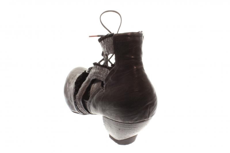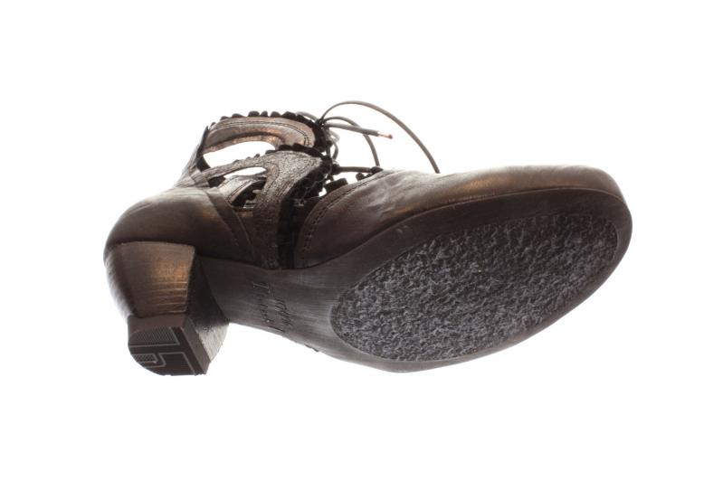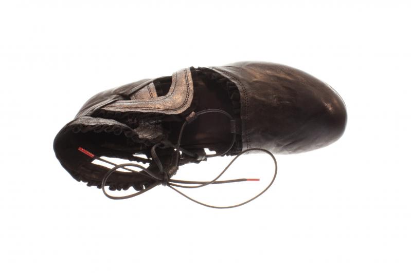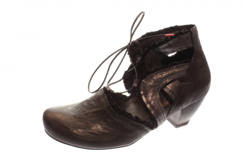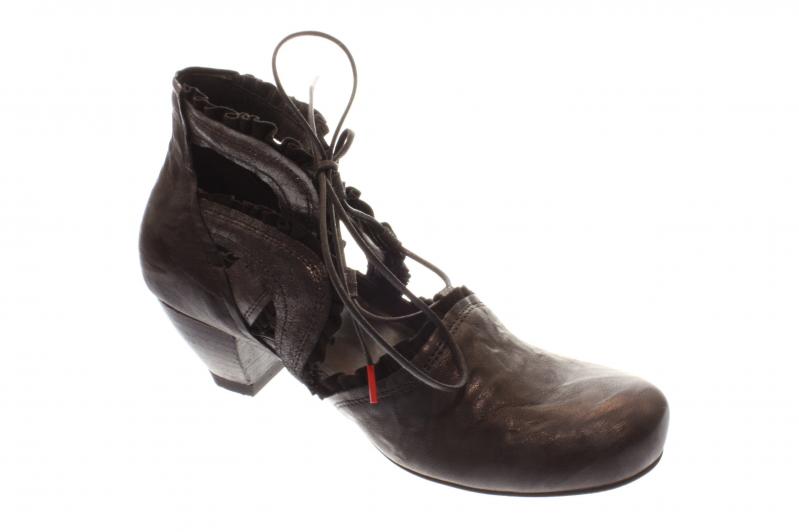 Bei diesem durchbrochenen Hochfrontpumps von Think! hat das Obermaterial am Schaft eine metallisierte Oberfläche und an den freien Stellen ist es mit schwarzen Rüschen verziert. Das Leder ist schön weich und angenehm zu tragen.