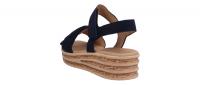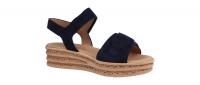 Eine modische Sandale von Gabor aus weichem Nubukleder in einem neutralen Dunkelblau. Ein besonderes Highlight ist die Keilplateausohle in korkähnlicher Optik. Für angenehmen Tragekomfort sorgt die gepolsterte Decksohle. Mit dem Klettriemen kann die Sandale schnell angezogen und die Weite am Knöchel gut angepasst werden.