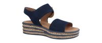Eine modische Sandale von Gabor aus weichem Nubukleder in einem sehr schönen dunklen Blauton. Ein besonderes Highlight ist die Keilplateausohle in korkähnlicher Optik mit blauen Streifen. Für angenehmen Tragekomfort sorgt die gepolsterte Decksohle. Mit dem Klettriemen kann die Sandale schnell angezogen werden und die Weite am Knöchel gut angepasst werden.