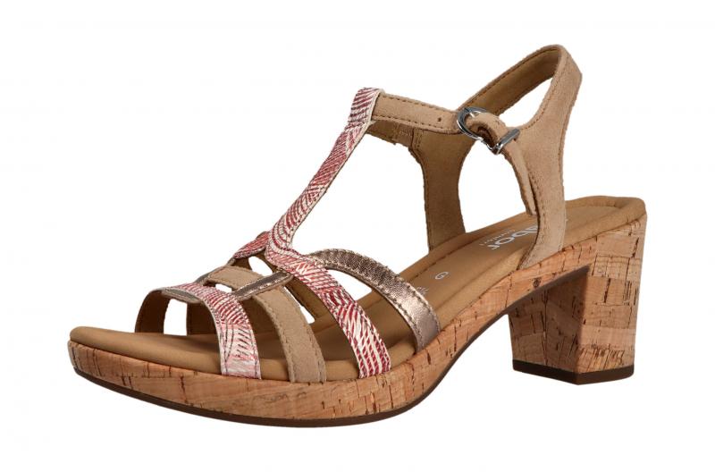 Schicke Sandalette von Gabor in Komfortweite G mit weicher Decksohle. Der Absatz ist aus Kork. Die Schnalle ist mit Gummizug unterfüttert. Schön ist die Kombination aus neutralem braunen Nubukleder, Metallicleder und bedrucktem Leder.