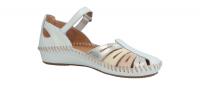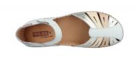 Die Sandale von Pikolinos bedeckt mit braun/goldenen Riemen die Zehen. Hinten sorgt eine Fersenkappe für einen guten Sitz und zusammen mit dem Klettriemen für festen Halt. Die Keilsohle ist angenehm zu tragen. Die komplette Lederausstattung macht den Schuh perfekt zum Barfußtragen.