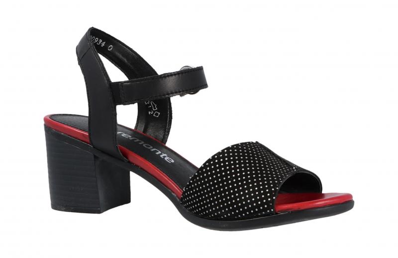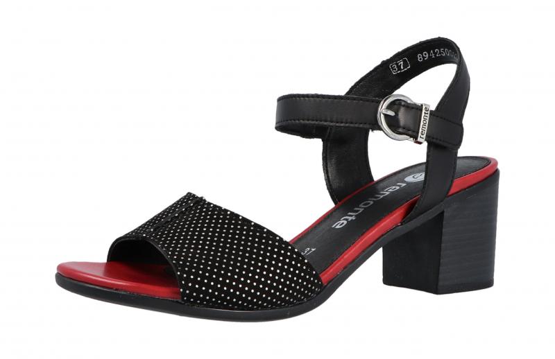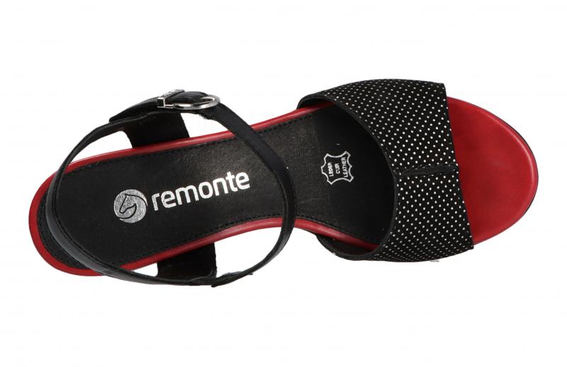 Die schicke Sandalette von Remonte besticht mit schwarz-weiß gepunktetem Nubukleder, schwarzem Glattleder und rot abgesetzter Sohle. Der Blockabsatz ist bequem zu tragen. Die Schnalle ist aufgesetzt, darunter befindet sich ein Klettverschluss zum schnellen Anziehen.