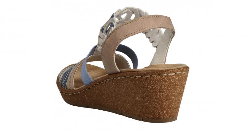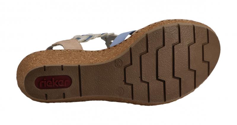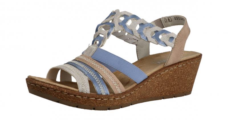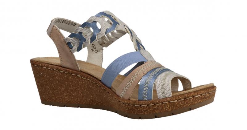 Die super leichte Sandalette von Rieker hat eine schöne Kombination aus Hellblau, Rosa und Beige. Das beige Material ist ganz leicht glänzend. Die Keilsohle ist in Korkoptik gehalten und leicht und flexibel. Gummizüge sorgen für die nötige Anpassung beim Anziehen und Tragen.