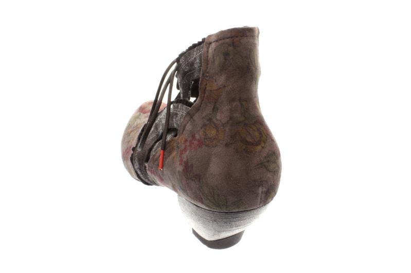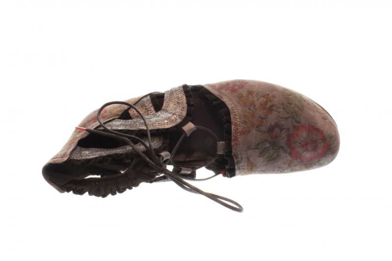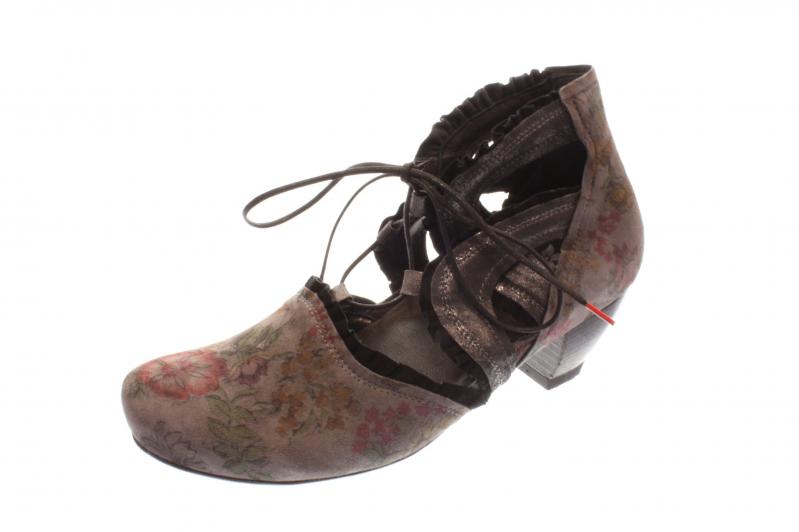 Durchbrochener Hochfrontpumps von der Marke Think!. Das Obermaterial hat ein buntes Blumenmuster und wird an den freien Stellen mit schwarzen Rüschen verziert. Das Leder ist schön weich und angenehm zu tragen. Mit der Schnürung kann die Weite angepasst werden.