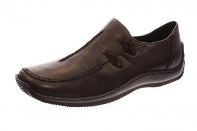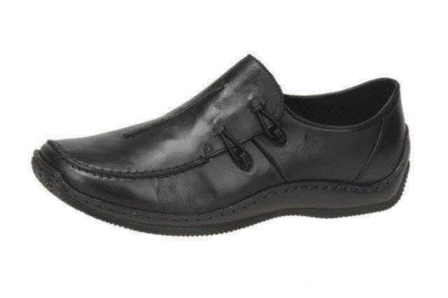 Ein sportlicher Slipper der Marke Rieker. Ein Gummizug sorgt für gute Anpassung an den Fuß. Schön ist die asymmetrisch verlaufende Ziernaht. Die Innensohle ist weich gepolstert.