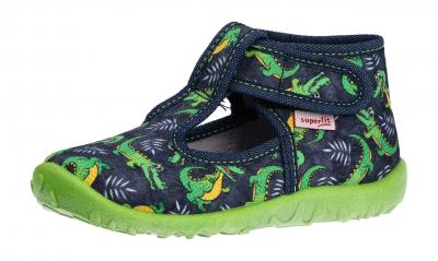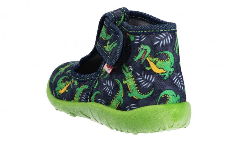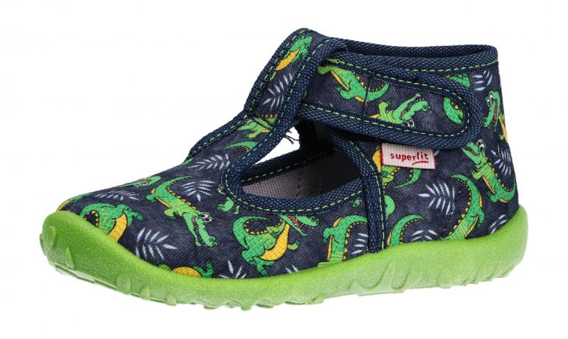 Ein süßer Hausschuh mit Kroko-Druck von Superfit. Er ist mit einem Futter aus 100% Baumwolle und einer abriebfreien, flexibelen Sohle ausgestattet. Die Fersenkappe ist höher gezogen, damit der kleine Fuß genug Halt und Stabilität hat. Die Ausschnitte lassen Luft an den Fuß.
