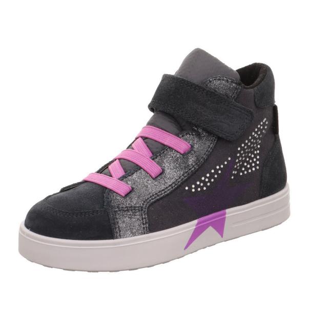 Leichter, knöchelhoher Mädchensneaker von superfit, der mit Softfutter und einer Sympatex-Membran, ideal für das wechselhafte Wetter im Herbst, ausgestattet ist. Die Sympatex-Membran macht den Stiefel zuverlässig wasserdicht und atmungsaktiv und sorgt für warme, trockene Füße. Der modische Charakter kommt durch die Silberapplikation (Stern) und die aufgesetzten Steinchen voll zum Tragen. Mit Hilfe des Klettbandes und des Gummizuges ist ein schnelles An-und Ausziehen möglich. Das Wechselfußbett kann jederzeit ausgetauscht werden.